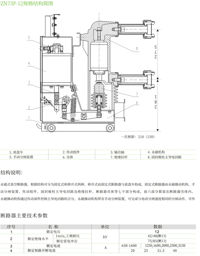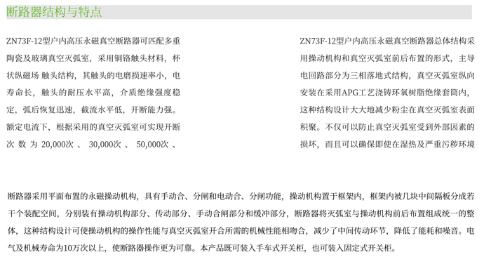 ZN73F-12型永磁機(jī)構(gòu)戶內(nèi)高壓真空斷路器是我公司通過總結(jié)多年來積累的豐富的現(xiàn)場(chǎng)經(jīng)驗(yàn),本著安全可靠、長壽命、少維護(hù)的設(shè)計(jì)理念,憑借雄厚的技術(shù)實(shí)力自主研發(fā)的新一代高壓真空斷路器。